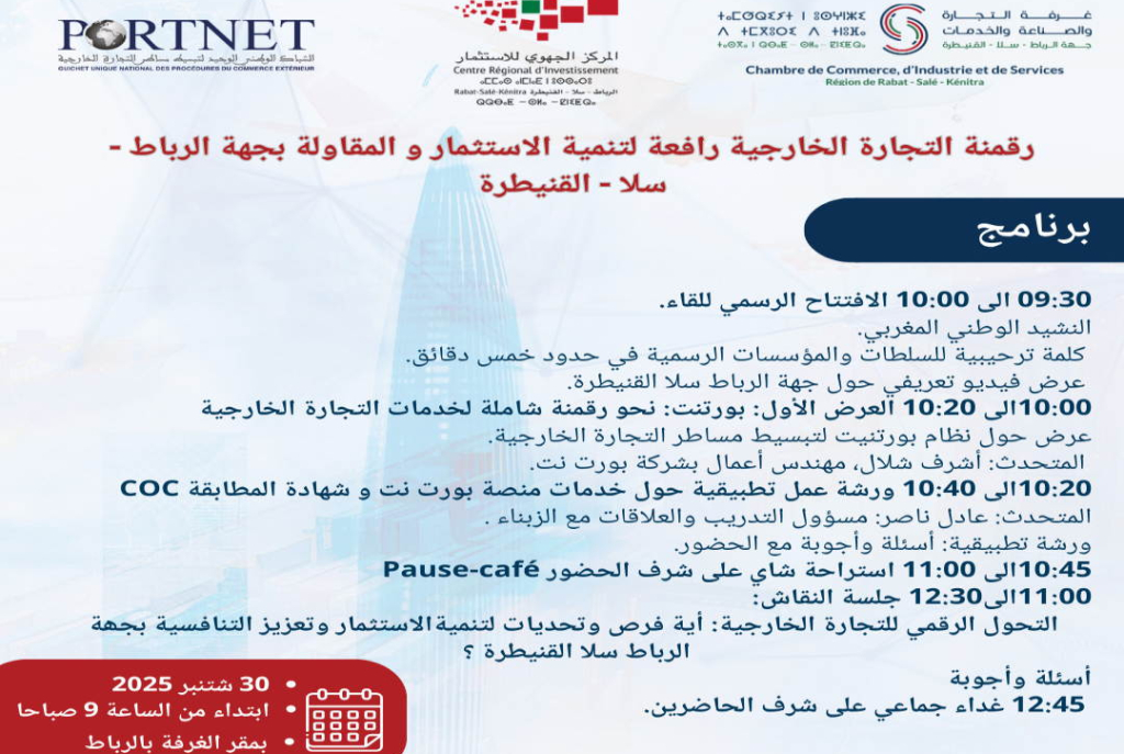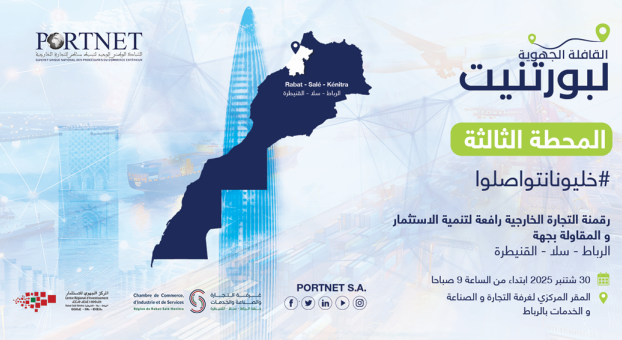 الرباط 30 شتنبر 2025 – في إطار استراتيجيتها الوطنية القائمة على سياسة القرب من الفاعلين الاقتصاديين، تنظم شركة بورتنيت المحطة الثالثة من قافلتها الجهوية بجهة الرباط – سلا - القنيطرة، وذلك بشراكة مع غرفة التجارة والصناعة والخدمات للجهة، والمركز الجهوي للاستثمار، والمندوبية الإقليمية للتجارة والصناعة بالرباط.