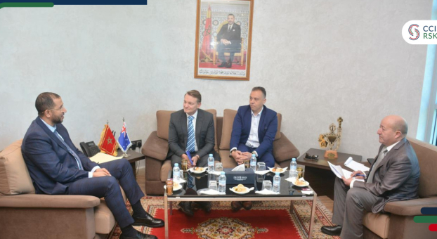 Dans le cadre du renforcement des relations économiques et commerciales entre le Royaume du Maroc et l’Australie, Monsieur Hassan SAKHI, Président de la Chambre de Commerce, d’Industrie et de Services de la Région Rabat-Salé-Kenitra (CCIS-RSK) a reçu, Mardi 14 Avril 2026, Son Excellence Monsieur Damien Donovan, Ambassadeur d’Australie au Maroc, accompagné de Monsieur Soufiane Rboub, représentant du Conseil d’affaires arabo-australien, dans le cadre d’une visite de courtoisie à la Chambre.